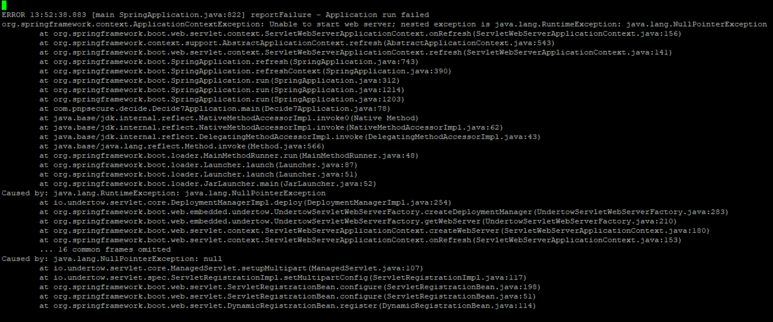 잘 동작하던 녀석이 Server 에 deploy 하면 아래와 같은 오류를 내뱉으며 startup 이 안된다.