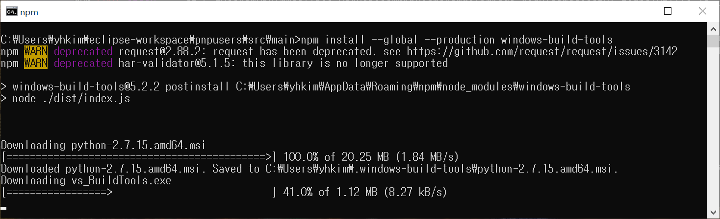 npm install --global --production windows-build-tools 를 통해 설치를 진행한다.